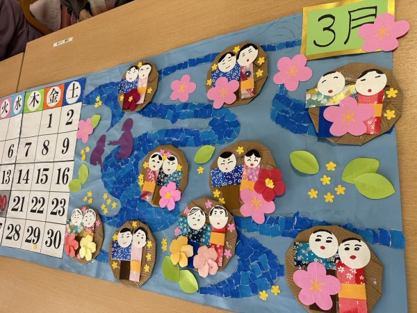 二階フロアでは3月の巨大カレンダー作り☆を少しずつ進めてきました。テーマは『紙皿の流しびな』です☆