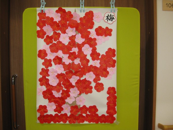 梅の花の貼り絵のご様子です( ^ω^)・・・ 満開の梅の花が完成しました(*^_^*)