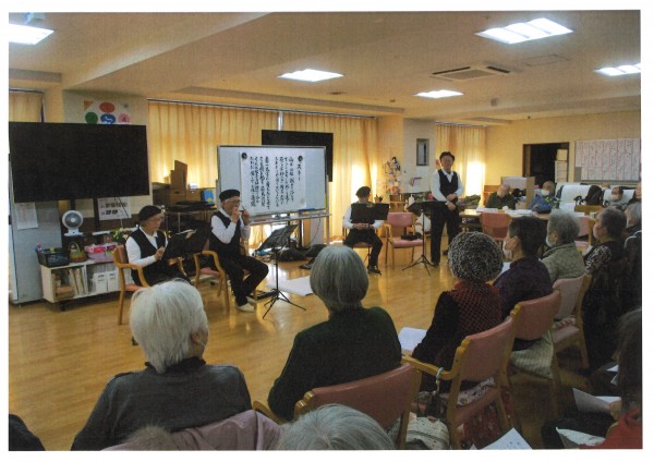 お揃いの衣装にベレー帽で、いつも素敵な演奏をしてくださる『高階南ハーモニカサークル』様々な音域のハーモニカを使い分け、唱歌からクラシックまで様々な演奏で楽しませてくださいます。そして、聞くだけでなく懐かしい曲を一緒に歌うことが出来るのもご利用者様に喜ばれています。今日もあっという間の1時間、素敵なレクリエーションを楽しむことが出来ました。『高階南ハーモニカサークル』の皆様、ありがとうございました♪