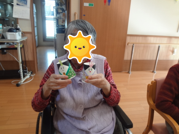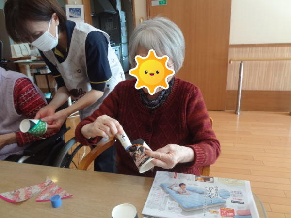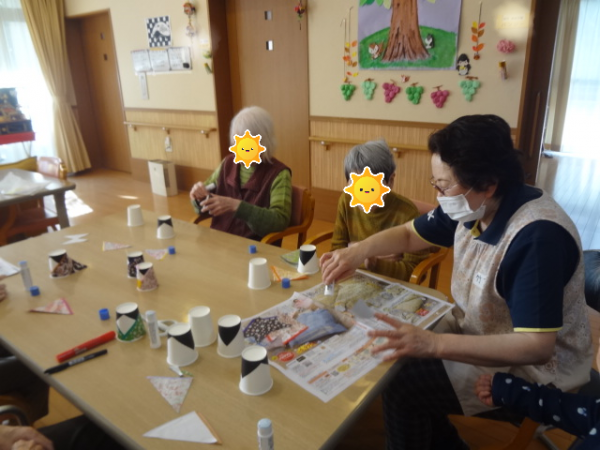 紙コップに折り紙で作った着物を貼って、ペンで顔を書いていただきました(^o^)丿