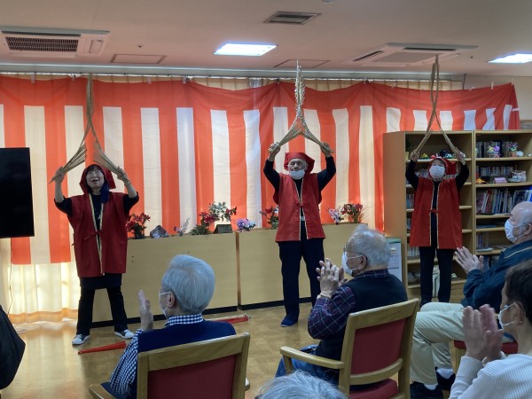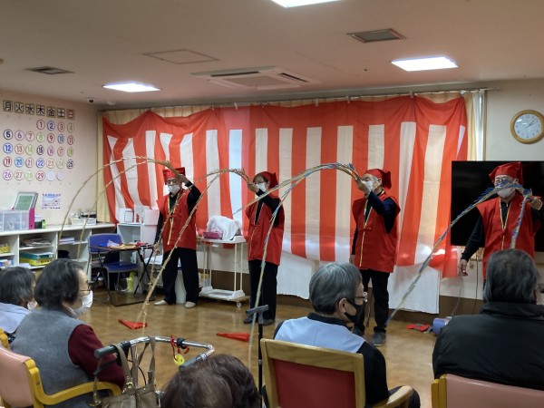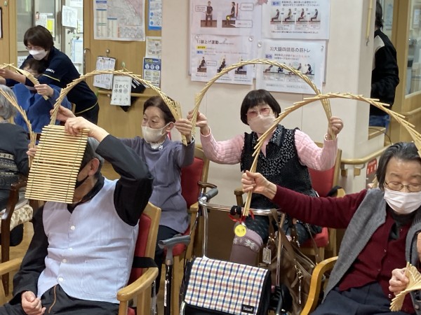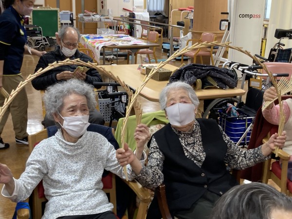 「尾間木玉すだれの会」さんがご利用者様全員分の玉すだれを用意して下さって、全員で玉すだれに触りました。