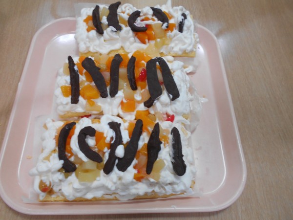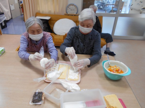 手作りのケーキの飾り付けを入居者様に手伝っていただき、皆様で頂きました。