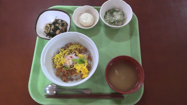 ●三色丼…甘辛の「鶏そぼろ」に「かにかまちらし・錦糸たまご」を使用し、彩り豊かな丼物にしました。