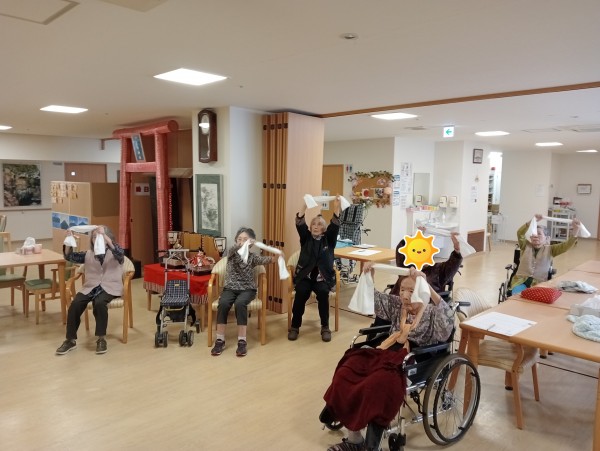 タオルを使ったり、手を上げたり、伸ばしたり・・・