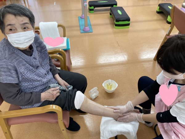 足から膝までしっかりとオイルを塗ってマッサージ。リンパ腺などを刺激して老廃物をすっきりと取っていきます♪