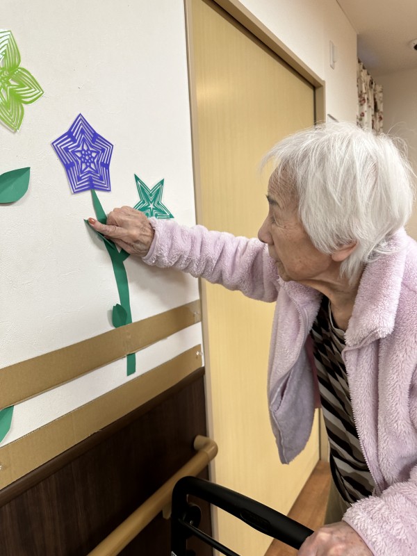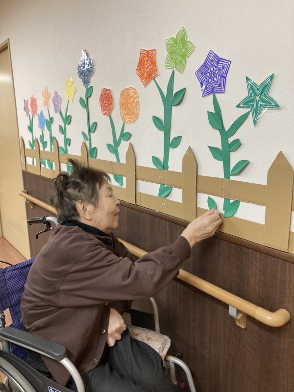 手先の器用な職員が折り紙を切り抜いていろいろな種類のお花をつくり