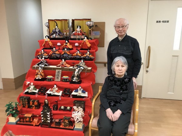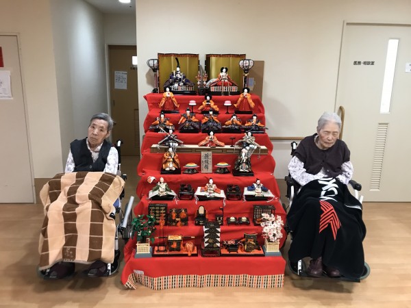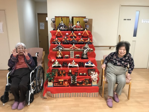 ひなまつり当日にひな壇の横で記念撮影をしました!皆様なんだかいつもより姿勢がとても良い気がします!2つのひな壇をじっくりと鑑賞して満足そうにされる方も居ました!