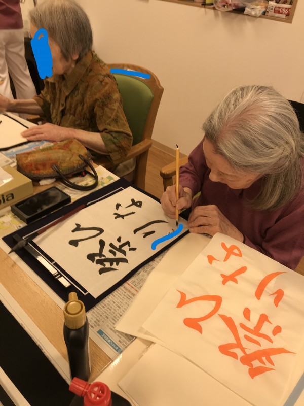 書道師範をもっているI職員が先生となり、みんなへ優しくアドバイスをしてくれました。どうしても書き出しって緊張してしまいますよね。でもいざ書き始めるとスイスイと書き上げることが出来ました!感無量の表情?!