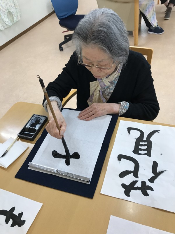 定期的に開催している書道の時間。今回は春らしい言葉をたくさん書き記します。