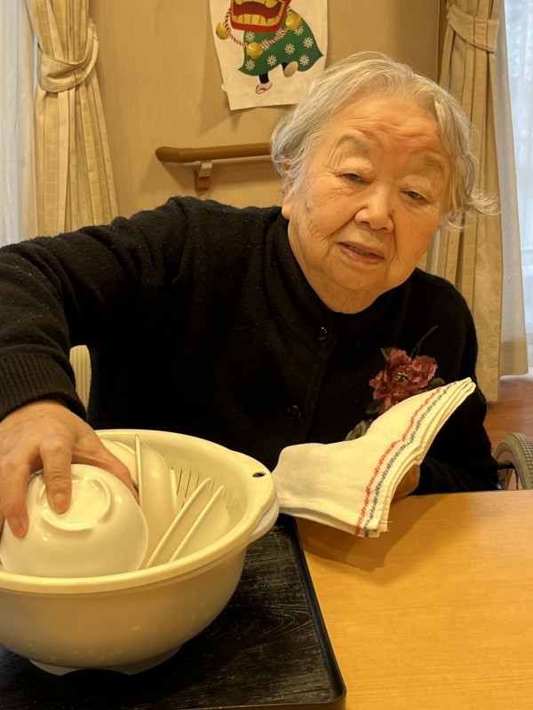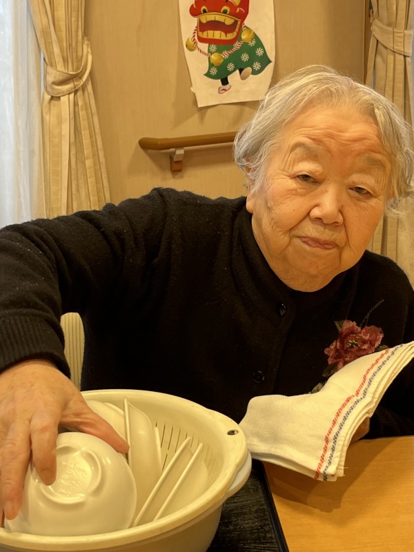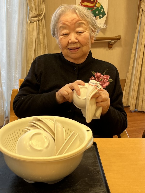「今、朝ごはん食べて、お皿拭いてるけど、お昼のご飯のおかず、何かしら?