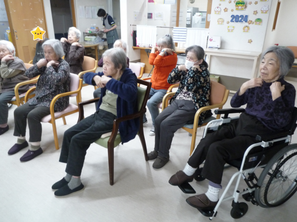 1Fに集まって、テレビ画面越しにヨガの先生と挨拶。