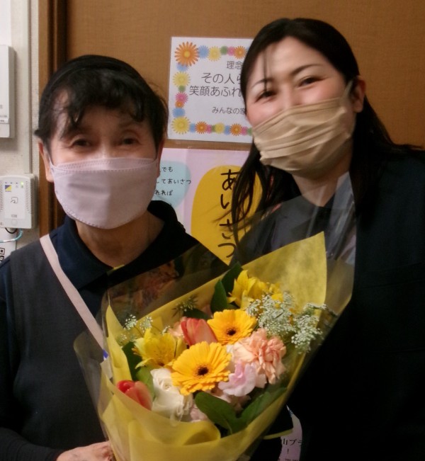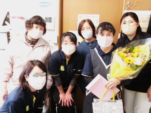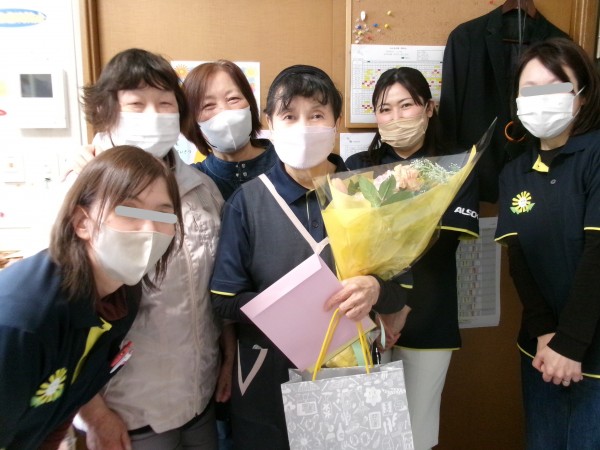 3/28 退職の朝 夜勤明け、最後の勤務を終えスタッフが続々と集まってきました。この施設で勤続23年間大変お疲れ様でした。これからは太極拳一筋に励むと話しておりました。優しい声掛けと素敵な笑顔、本当にありがとうございました!今度は遊びに来てね!