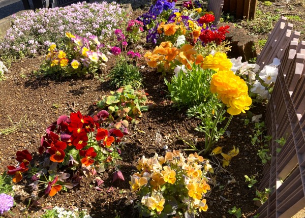 畑の横にある花壇も色とりどりのお花が咲いて、春めいてきました♪