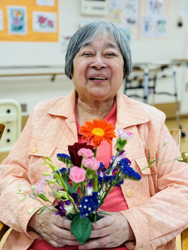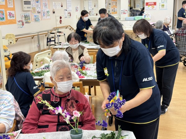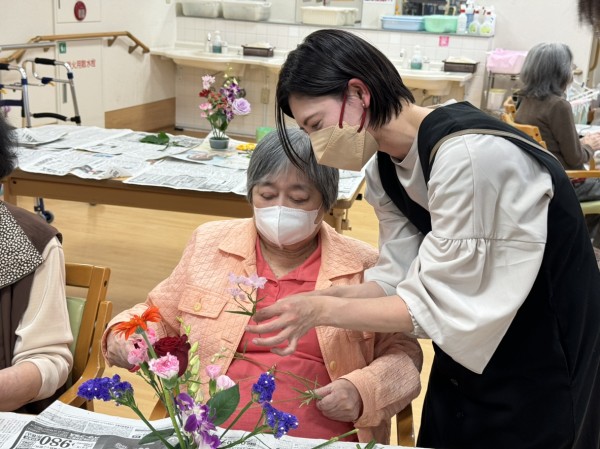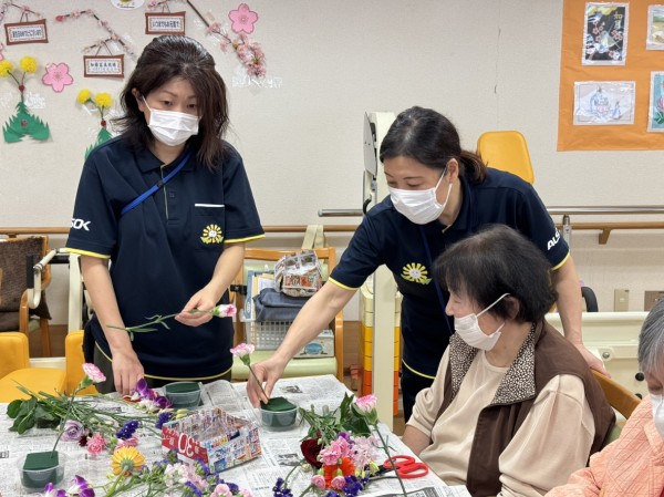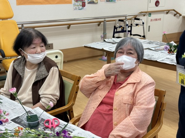 特別合同企画(デイサービス遊・西東京とデイサービスひばりが丘)です! 皆様楽しみにされていました企画です。まず、新聞を下に敷き切り花や『オアシス』等、材料をテーブルの上に準備しました!