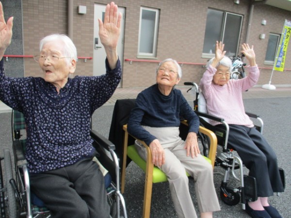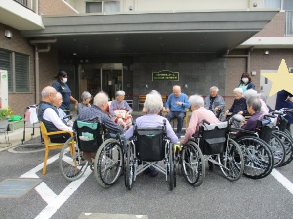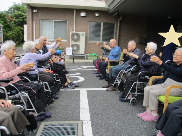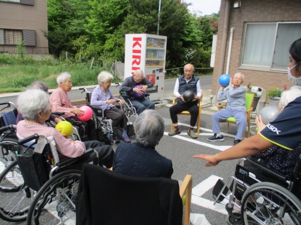 本日内野本郷の敷地内で各階のご入居者様が集まりボールを使って