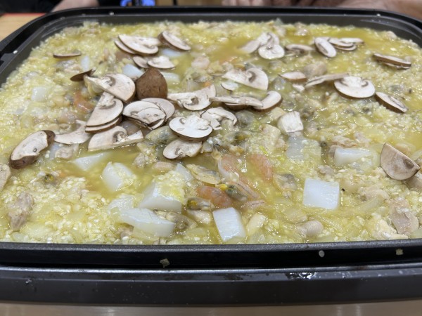 シーフードのいい香りにフロアー内が包まれて、皆口々に「早く食べたいね〜」と!彩の綺麗な海鮮パエリアが完成して、フタを開けると皆さん歓声をあげていました‼️