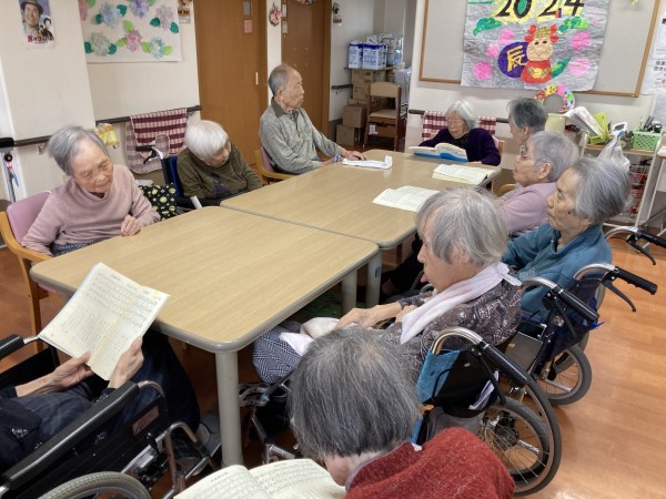 皆さんで楽しく歌集を見ながらCDに合わせて歌い、2階と3階も交えて行っています。
