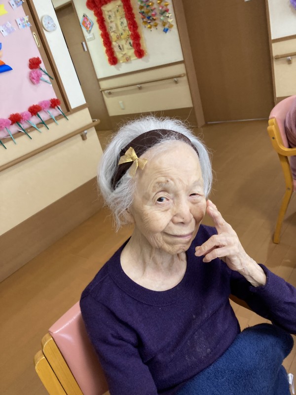 今回は1F訪問運動教室の前のおめかし、髪飾り付けました!です。