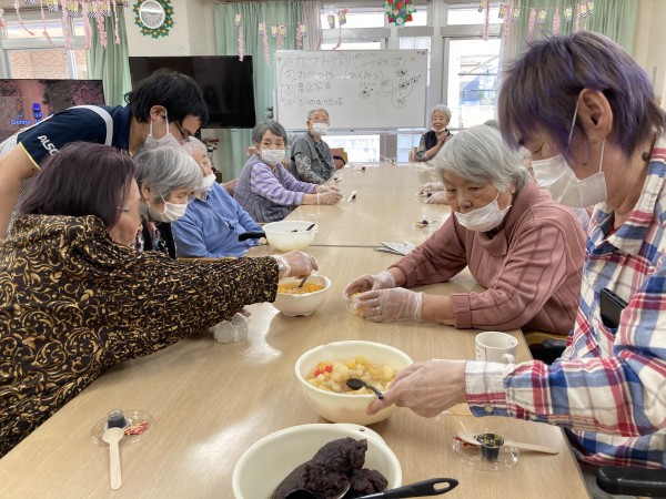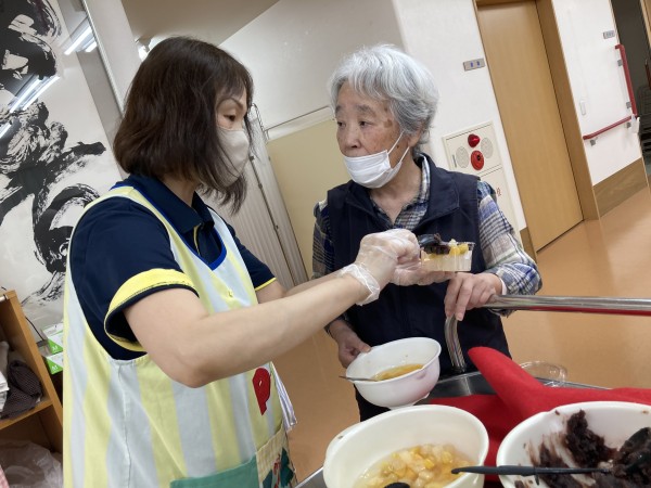 作ったあんみつを皆様と一緒に召し上がっています♪「甘くておいしいー」と絶賛のお言葉をいただきました♪