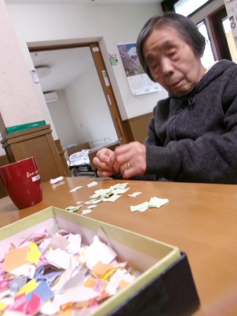 3/25 おやつの後は、ちぎり絵が始まりました!さーて、何ができるかな?