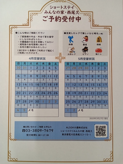 ☆ショートステイみんなの家・西尾久・空き情報☆