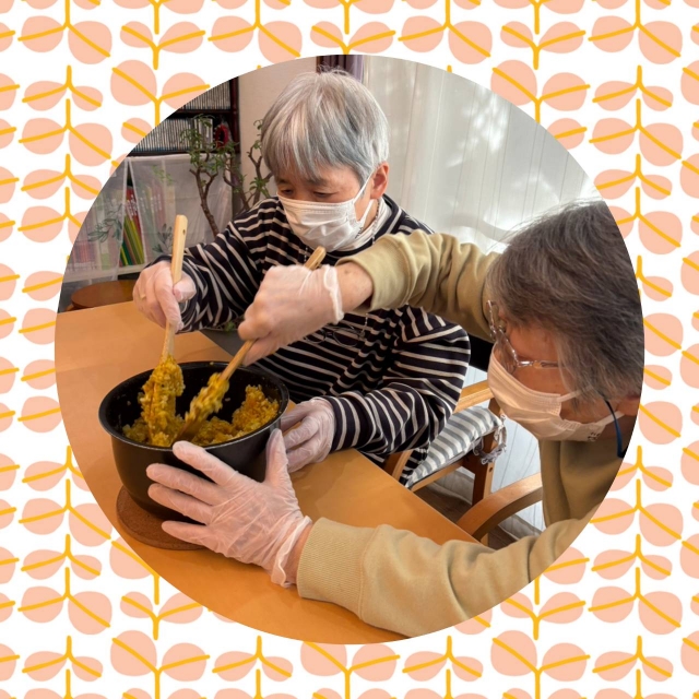 ここでは、その日の気分や体調に合わせ、のんびり過ごしたり、みんなでお料理や手芸をしたりと自由で自立した時間を楽しんでいただいております。