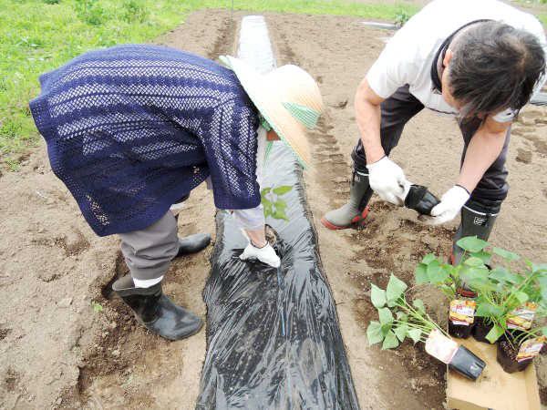 職員と一緒に参加いただいています。夏野菜のトマトやナスなど、採れたての野菜は皆さんのお食事にご提供しています!