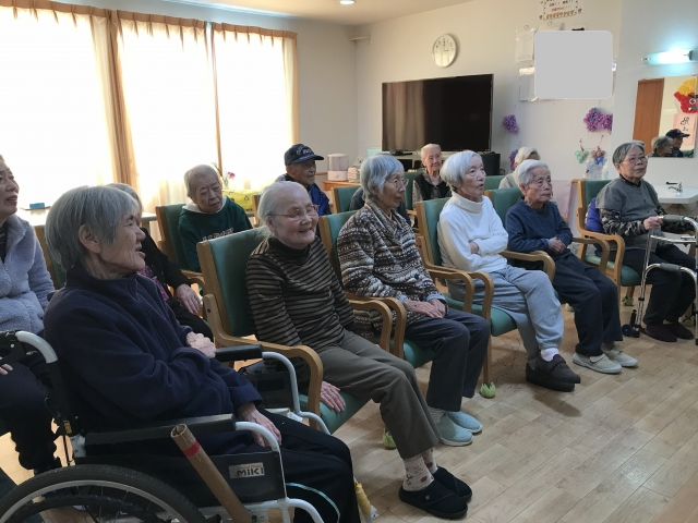 車いすの方も座ったまま安全にできる体操は毎日行い、スタッフとの会話や普段意識しない筋肉を動かすことで皆さまの健康をサポートします。