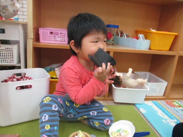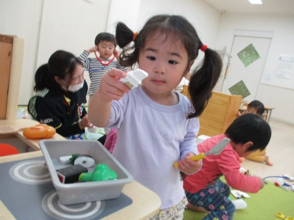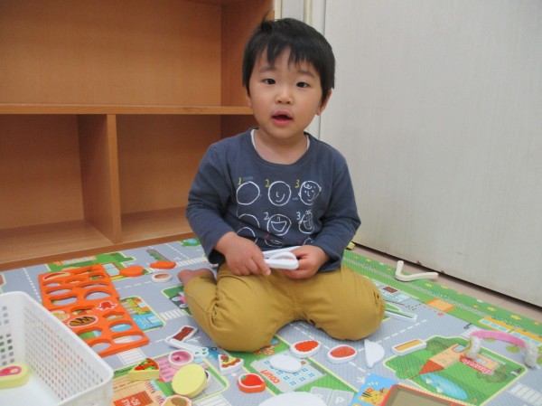 進級したお友だちは、早速新しいお部屋での遊びを楽しんでいます。ドーナツやお寿司のパーツを並べたり、おままごとをしたり…