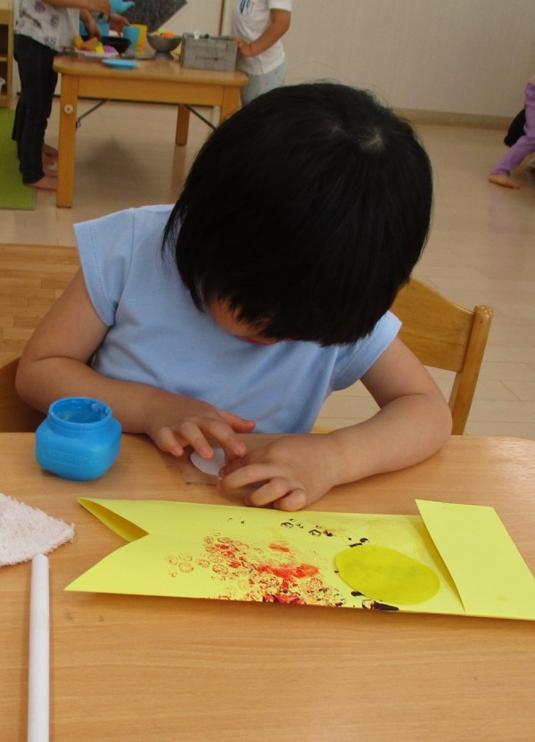 好きな色を2色選んでスタンプしました。模様が出来たり、色が混ざって変化が出ると嬉しそうにしていました。