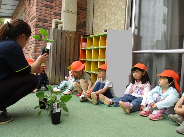 毎日、ナスの苗を見に行っては、大きくなったか確認している子ども達です。