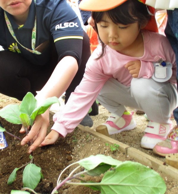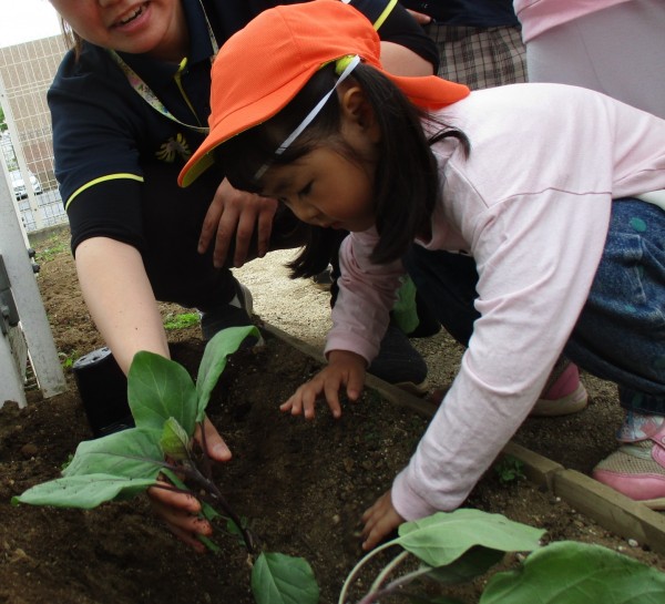グループごとに順番にナスを植えました。1人ひとり保育者と一緒にナスに土を掛けて「大きくなってね」声を掛けました。