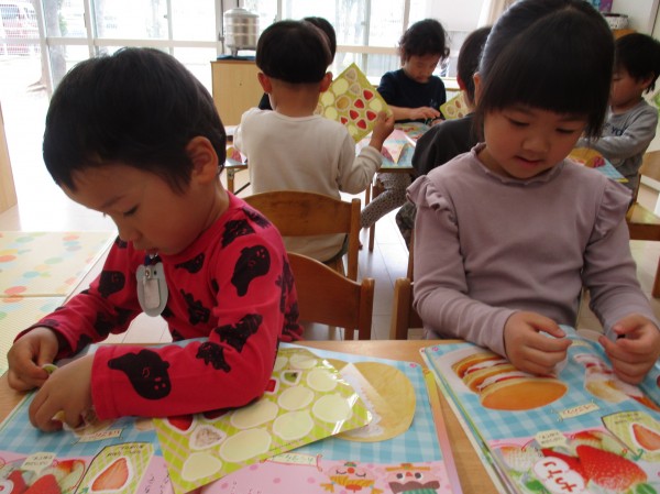 「ここに貼ろう!」「このいちごはどうしようかな…」と、それぞれ考えながら貼りました。