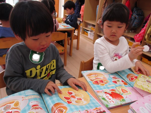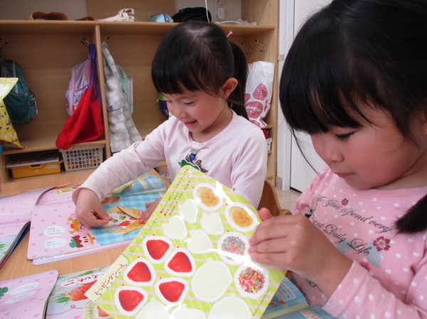 実はこのシールはいちごの甘いにおいがするので、「いちごのにおいがするね♡」と大盛り上がり。