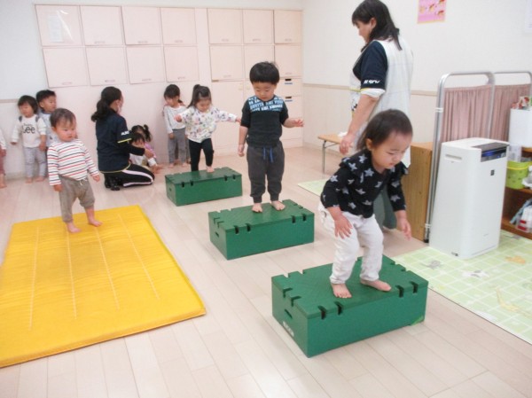 保育者のお話をしっかり聞いて順番に並び、まずは巧技台からスタート!