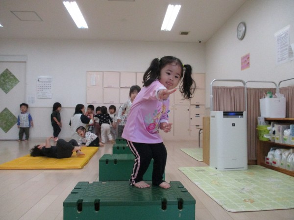 雨の日や園庭が使えない日は、室内でたくさん体を動かして遊んでいるらっこ組さん。