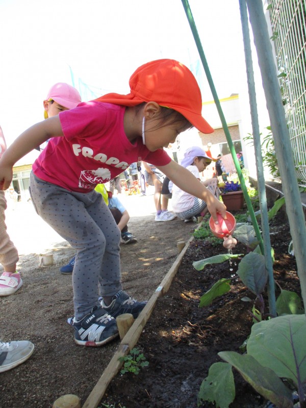 晴れの日には、自分たちで植えたなすにせっせと水やりをしています。