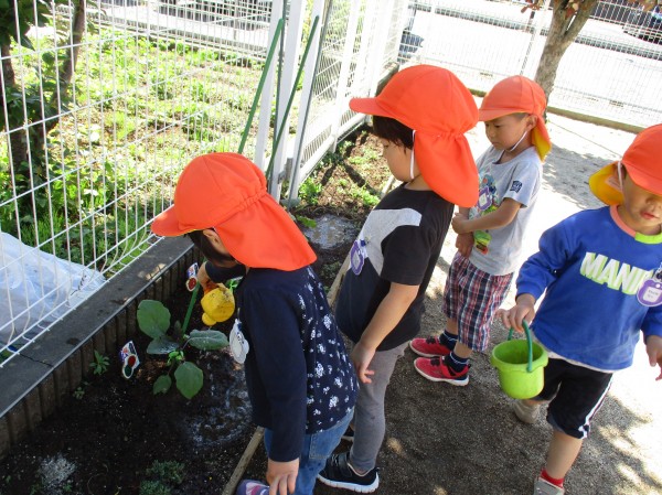 「早く大きくなってね」と声を掛けながら水やりをしているお友だちもいて、なすの成長を心待ちにしています。