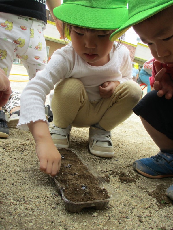 前年度の2歳児で育てたオクラから採れた種を今年度の2歳児が引き継いで植えてみることにしました。