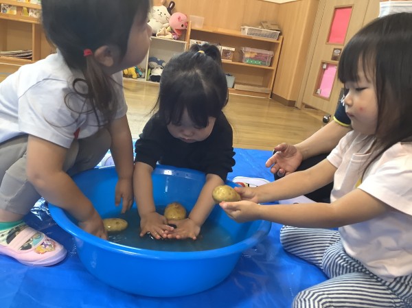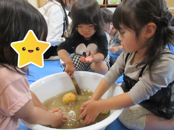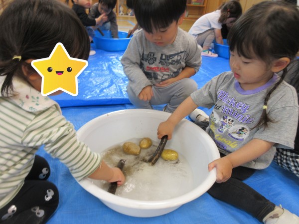タライに入っているお水で、ごぼうとじゃがいもの泥を落としました。