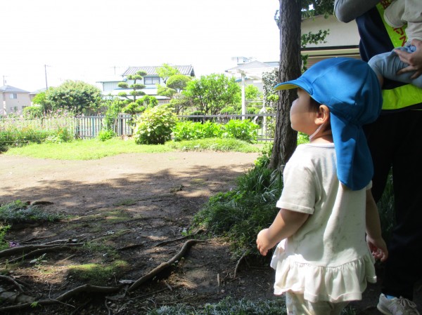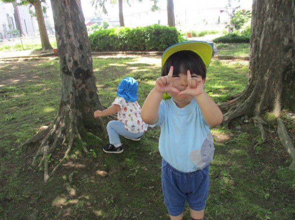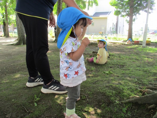 探検に行った子は木陰でお花を見たり、葉っぱを拾ったりしています。過ごしやすく、頬をなでる風が気持ちいいです。