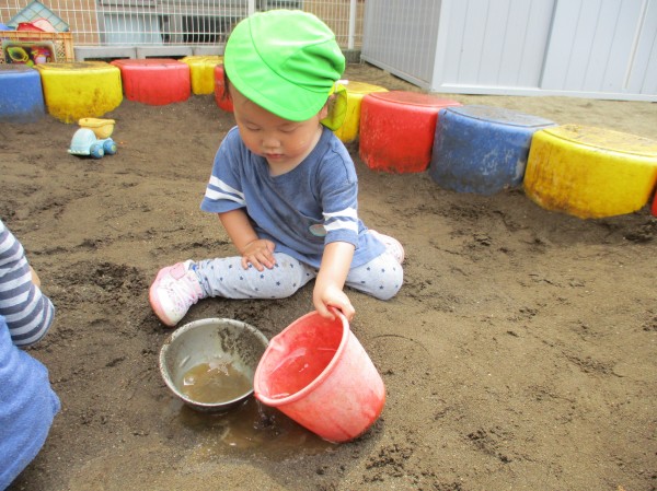 バケツに水を入れてもらうと、ワクワクした表情で運び、触れたり砂と混ぜたり…