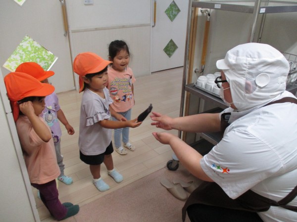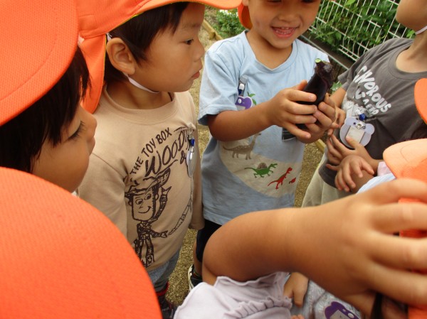 なすは一つだけなので、みんなで順番に触ったり見たりしました。「冷たい」「つるつるするー」と言いながら喜んでいました。