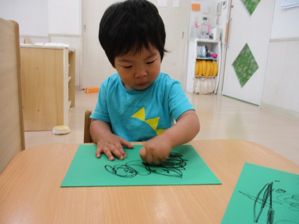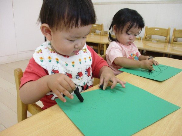真っ直ぐな線を描いたりグルグルと線を描いたり、思い思いにクレヨンを動かして描くことを楽しんでいます。