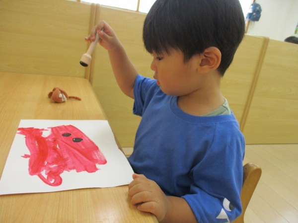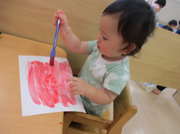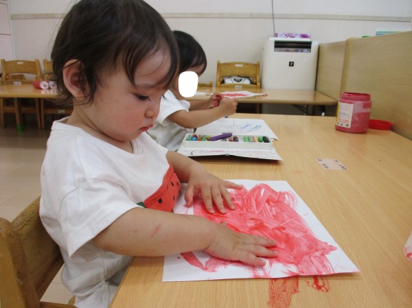 最後に黒い絵の具で種を描くと、スイカっぽい色合いになり嬉しそうな子どもたち♪
