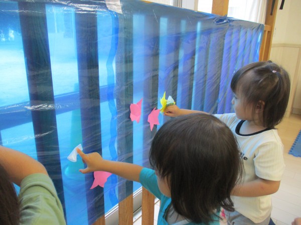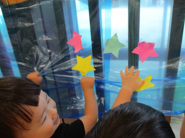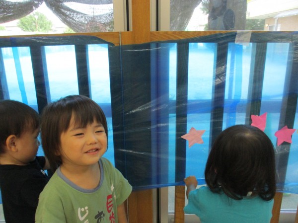 午後は青色のビニール袋を天の川に見立てて星を貼って遊びました☆