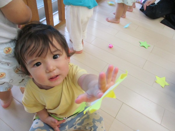 星をぺたぺた貼ったり剝がしたり、体や玩具に貼ってみたりして楽しんでいた子どもたちでした。