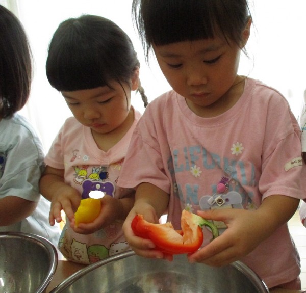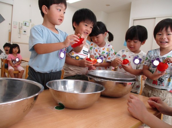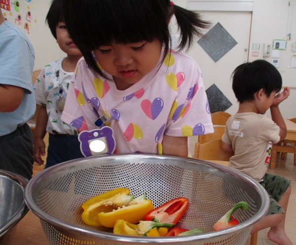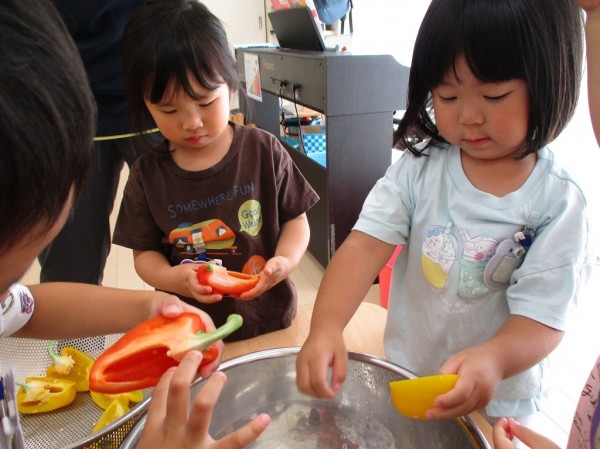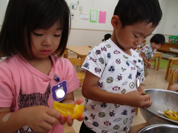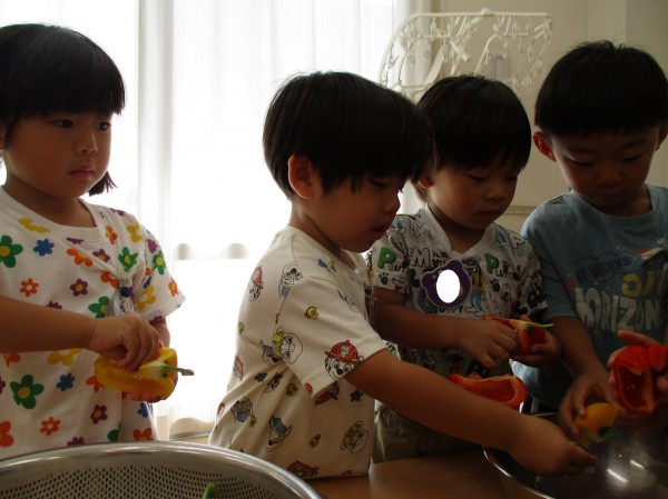 保育園でも夏野菜カレーが出ました。今回はカレーに入るパプリカの種取りのお手伝いをしました。