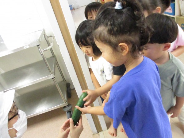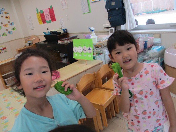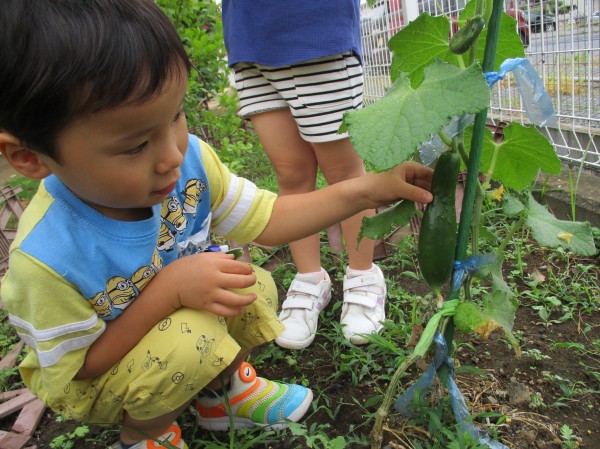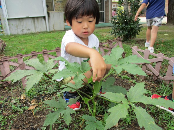 いるか組(4歳児)は畑できゅうり・ピーマン・オクラを育てています。
