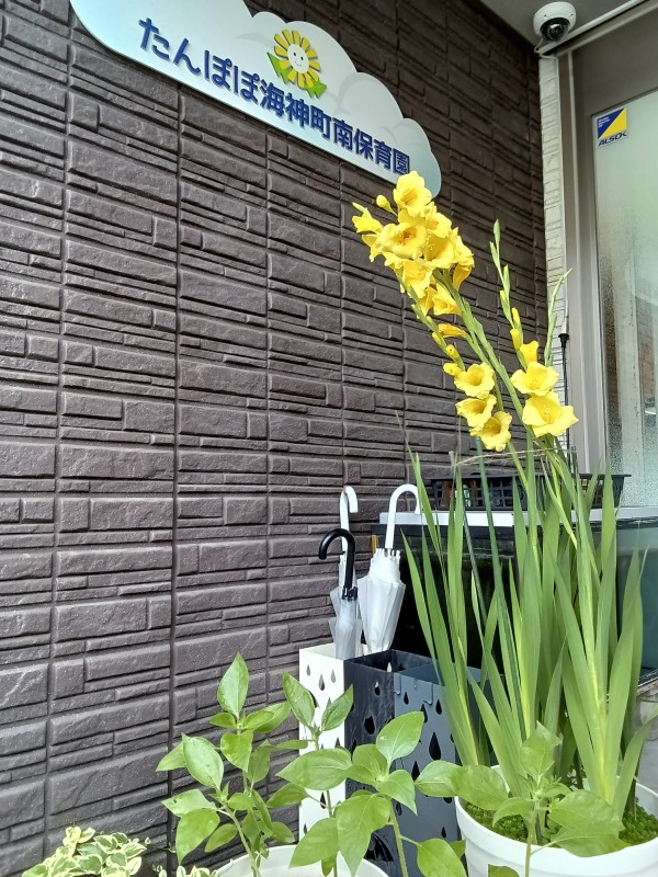 玄関前、みごとなグラジオラスが咲きました。たんぽぽ海神町南保育園の看板の黄色より、鮮やかな黄色ですね。
